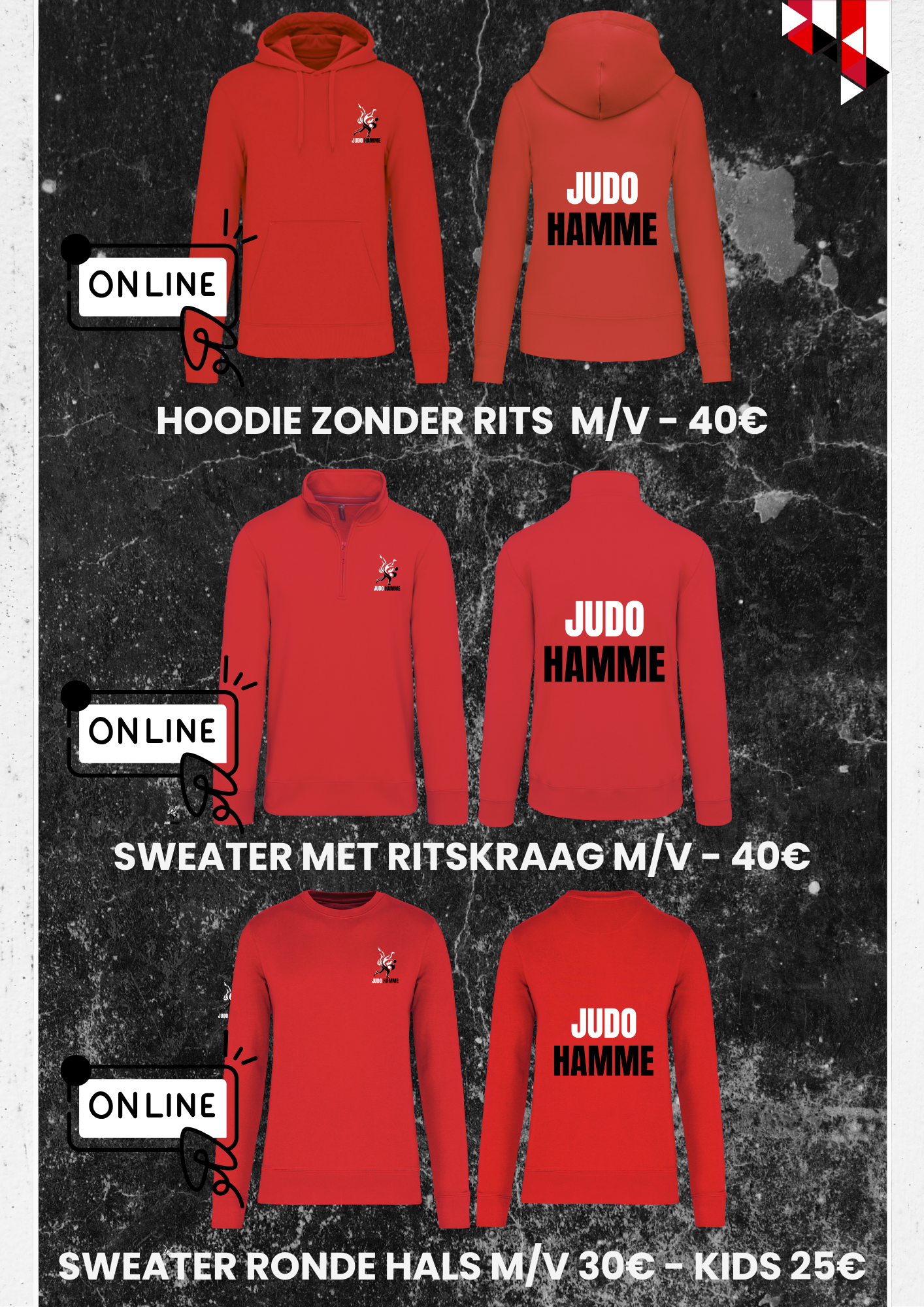 Hieronder vind je een overzicht van onze officiële clubkledij en onze nieuwe casual collectie van Judo Hamme.