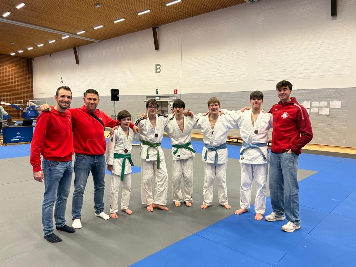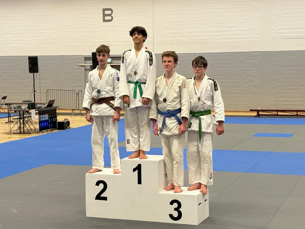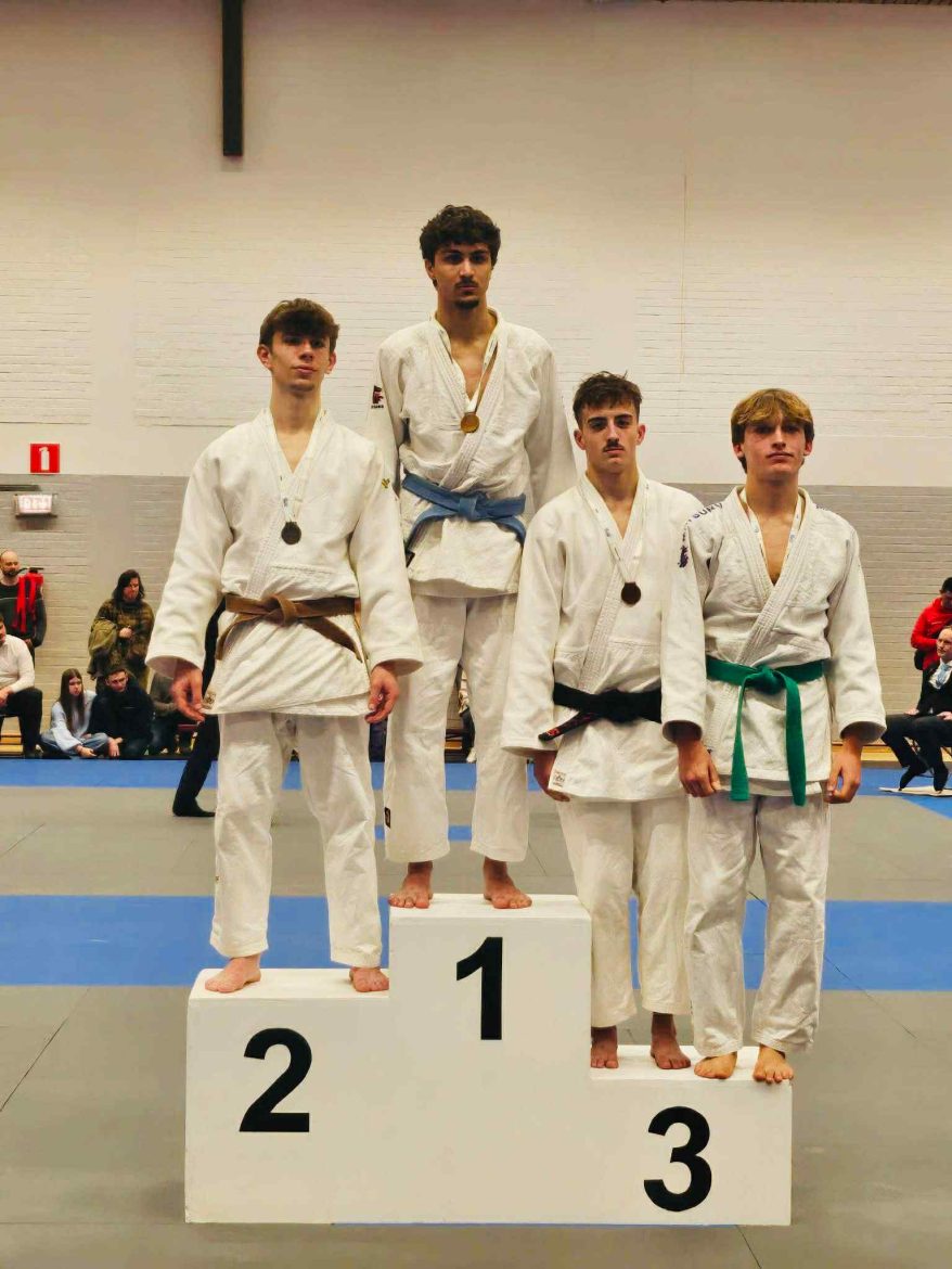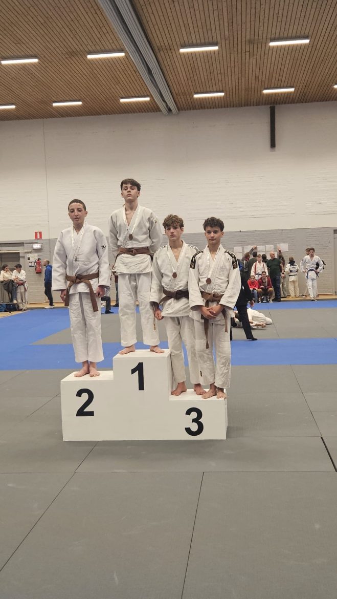 Als laatste kwamen de U15-jongens aan de beurt. Voor Aboubakar, Sen en Sepanta zat het tornooi er helaas snel op. Aboubakar stond zelfs voor in zijn kamp, maar verloor door een scheidsrechterlijke fout (achteraf toegegeven). Zuur, zeker omdat dit mogelijk een Vlaams ticket kost… Maurits, in dezelfde reeks, verloor zijn eerste kamp tegen de latere finalist maar vocht zich knap terug naar brons 🥉. Bilal stond duidelijk frisser dan in Lendelede en dat vertaalde zich in een mooie 3de plaats. Wout en Eduard begonnen allebei met winst in dezelfde reeks. Eduard kon dat niet verderzetten en eindigde 5de. Wout herstelde zich na een foutje in de halve finale en pakte brons. Finn had slechts één tegenstander en liet geen twijfel bestaan: een vlotte overwinning!