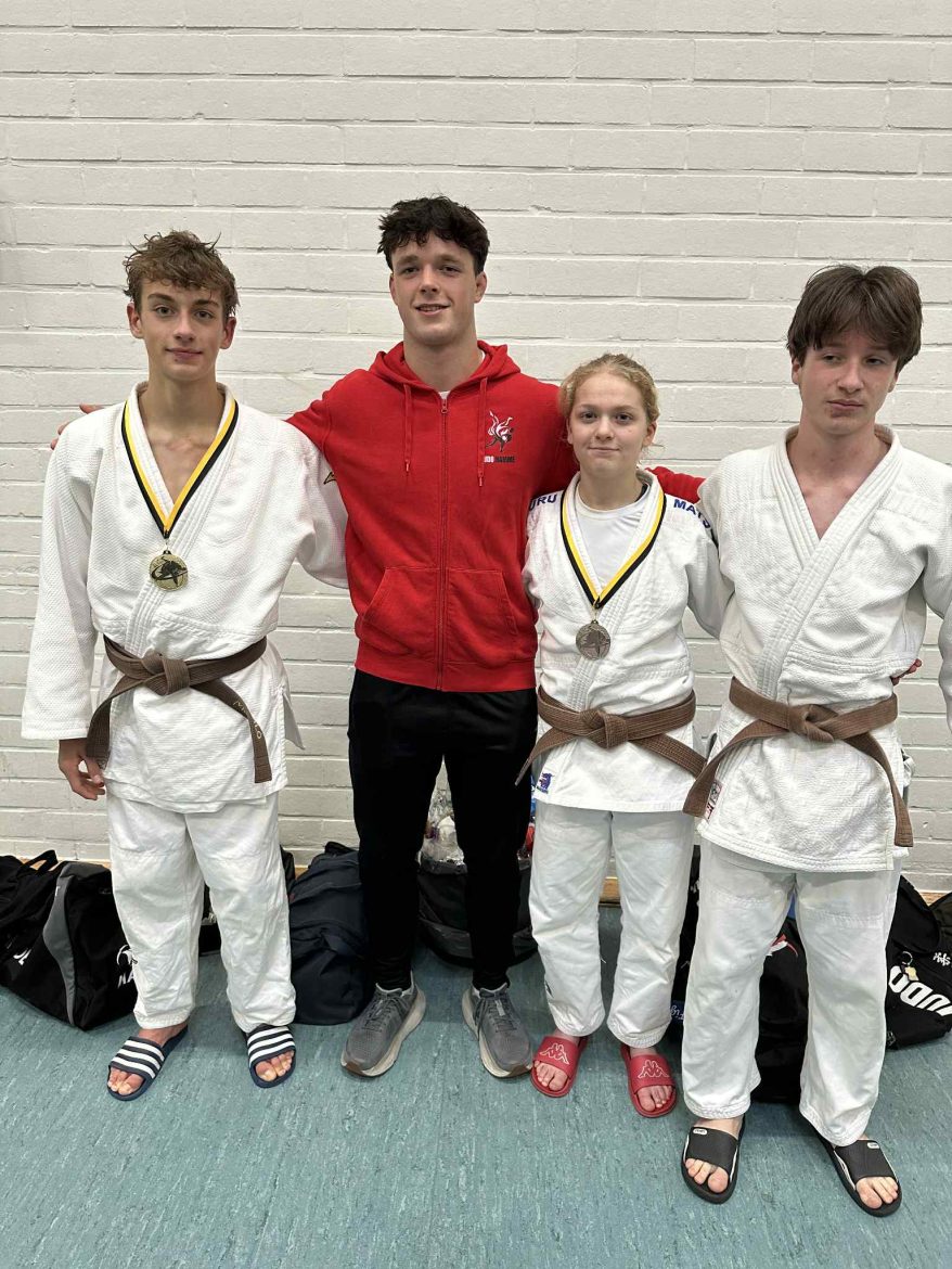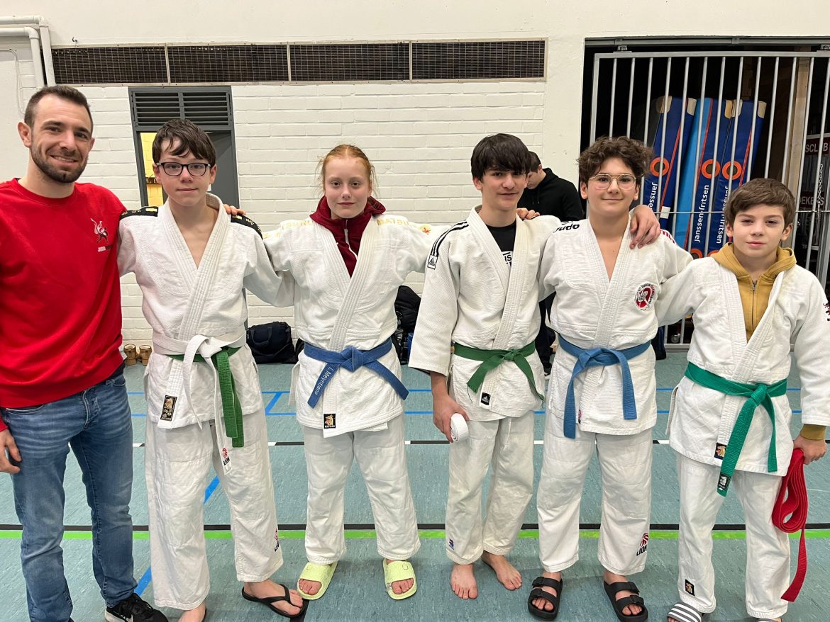 De U18 waren iets talrijker aanwezig en kampten onder het toeziende oog van Noah. Ruhn staat zijn mannetje in de -46 en dient maar 1 kamp prijs te geven in een poule van 5. Zilver! Ook voor Rose was zilver weg gelegd in een poule van 4. Joran en Basil kampen samen in de -55. Beide doen een worp naar een podiumplaas via de herkansingen maar dienen zich tevreden te stellen met een 5de plaats, zonde want ze toverden beide enkele heel mooie scores uit hun hoed. Mauro legt een foutloos parcours af in de -60. Goud, proficiat!Senne (-50) en Mauritz (-66) konden niet winnen.